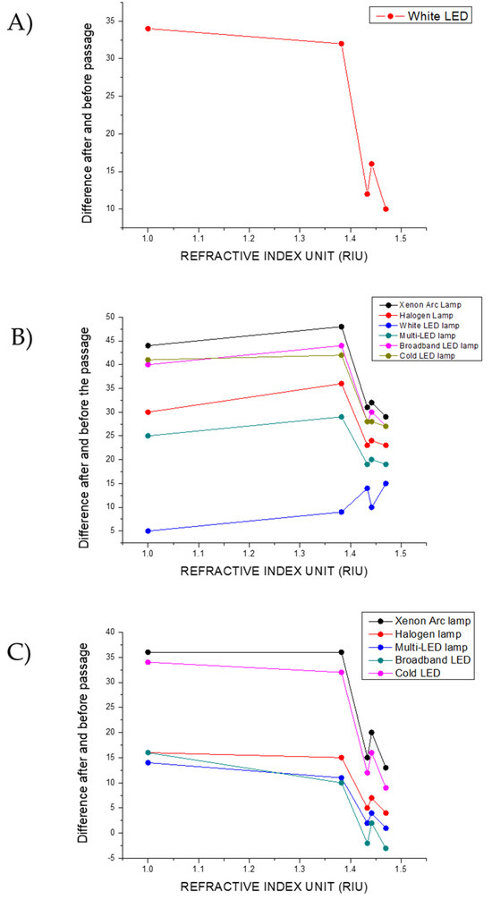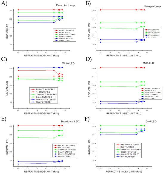 Among all the light sources considered, only the White LED lamp showed a difference between the values of the transmitted light and the light source in the red channel (Figure 14A). Therefore, it is the only light source able to produce a signal in devices interrogating that channel.