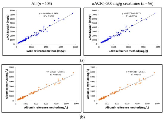 The correlation between the uACR, albumin, and creatinine values determined by MyACR and the reference method was analyzed. Results showed an excellent correlation between all parameters of the POC device MyACR and the reference method determined. The r2 in the samples with uACR > 300 mg/g creatinine ranged from 0.9720 to 0.9830, while those in all samples ranged from 0.9769 to 0.9836 (Figure 3a–c).