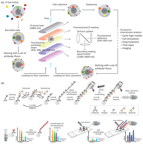 High-performance fluorescence and mass flow cytometry: (a) High-content fluorescence flow cytometry with barcoded single cells based on spectral encoding (Figure permission from [41]); (b) High-resolution mass flow cytometry where cycle extension was included for signal amplification (Figure permission from [42]).