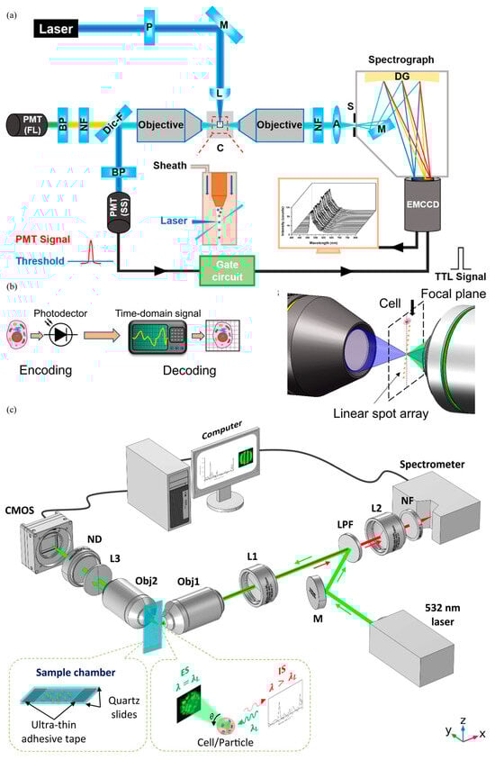 As to the development of other types of flow cytometry with labeling, Yan’s group from the Xiamen University reported spectral nano flow cytometry, where a spectral unit was integrated to home-developed nano flow cytometry, enabling sensitivity improvements from both scattering lights and fluorescence (see Figure 6a) [52]. In addition, Zhao’s group from the Huazhong University of Science and Technology developed imaging flow cytometry incorporated with a linear spot array for excitation, significantly extending scalability (see Figure 6b) [53]. Furthermore, Su’s group from Shandong University integrated elastic and Raman scattering based on a single-wavelength excitation to effectively investigate cell samples in a label-free manner (see Figure 6c) [54].