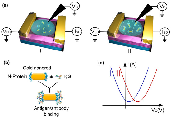 In this study, we developed a G-FET biosensor for detecting anti-N-protein IgG in human serum (Figure 1a). To facilitate IgG detection, gold nanorods, functionalized with SARS-CoV-2 N-protein at their extremities (Figure 1b), were deposited onto the graphene surface. This hybrid graphene–nanorod system eliminated the need for blocking agents, simplifying the biosensor fabrication process. Binding of the anti-N-protein IgG and the N-protein led to a charge transfer on the graphene surface, which was discerned through variations in the GFET transfer curve (Figure 1c) [34]. Using a monoclonal anti-N-protein IgG antibody, our biosensor achieved an LOD of 100 pg/mL. Moreover, as a proof of concept, clinical tests conducted using human serological samples demonstrated a success rate of 90% in comparison to ELISA, with results achieved in less than 15 min, providing robust evidence of the potential application of our hybrid sensor for point-of-care diagnostics.