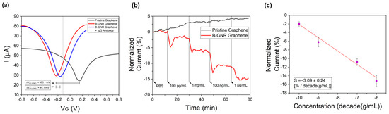 (a) The measurements of the transfer curves, with VSD = 0.1 V, for pristine graphene (black line), after B-GNR solution deposition on graphene (red line), and after antigen/antibody binding (blue line). (b) The variation in the normalized current at a series of concentrations (100 pg/mL~1 μg/mL) of the target monoclonal IgG antibody in pristine graphene (black line) and in B-GNR graphene, for different concentrations of target IgG monoclonal antibodies (red line). (c) A calibration curve for the series of target monoclonal IgG concentrations (semi-log scale). The error bars indicate standard deviation based on measurements with different devices.