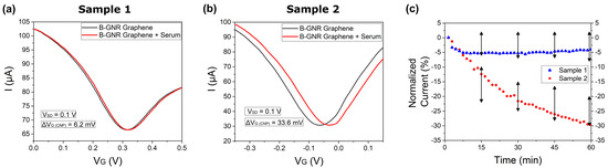 Transfer curves from exposure of the biosensor to human sera for 1 h. (a) A rightward shift in the transfer curve after exposing the biosensor to human serum that did not contain IgG antibodies (Serological Sample 1). (b) A rightward shift in the transfer curve after exposing the biosensor to human serum containing IgG antibodies (Serological Sample 2). (c) The current normalization of transfer curves A (blue) and B (red), as well as the black arrows, shows the range of results obtained from 10 different serological samples.