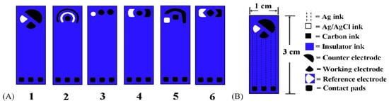 (A) Tested electrode configurations for SPEs made of carbon and (B) first configuration showing the sliver tracks and physical dimensions [] (reprinted with permission from Elsevier).