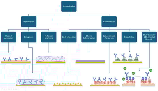 Multiple techniques can be used to accomplish the immobilization, as presented in Figure 3, which can be split into two categories, based on the interactions involved: physisorption and chemisorption. Physisorption is based on weak interactions such as van der Waals forces while chemisorption is based on strong interactions like covalent bonds [,]. It is common to use or combine multiple techniques for immobilization to modify the surface, create functional groups, and achieve better reproducibility, stability, and performance [,,,,,].