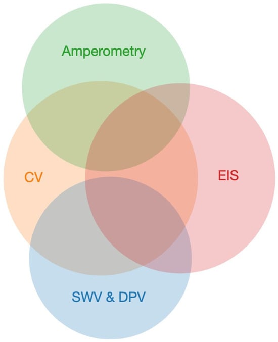 CV and electrochemical impedance spectroscopy (EIS) have emerged as the most commonly utilized techniques in electrochemical biosensors over the last ten years, as illustrated in Figure 4. This can be related to simplicity of CV and the wealth of information it can provide on the electrochemical reactions and utility of EIS in quantitative characterization of the electrode-solution interface. Another factor is wide-spread availability of inexpensive computer-controlled potentiostats, which offer both EIS hardware capabilities and software tools for efficient fitting of the obtained spectra. They are closely followed by amperometry and pulse voltammetry techniques—differential pulse voltammetry (DPV) and square wave voltammetry (SWV). Another interesting insight is that multiple techniques are commonly used in combination as illustrated by the overlapping of circles in Figure 4.