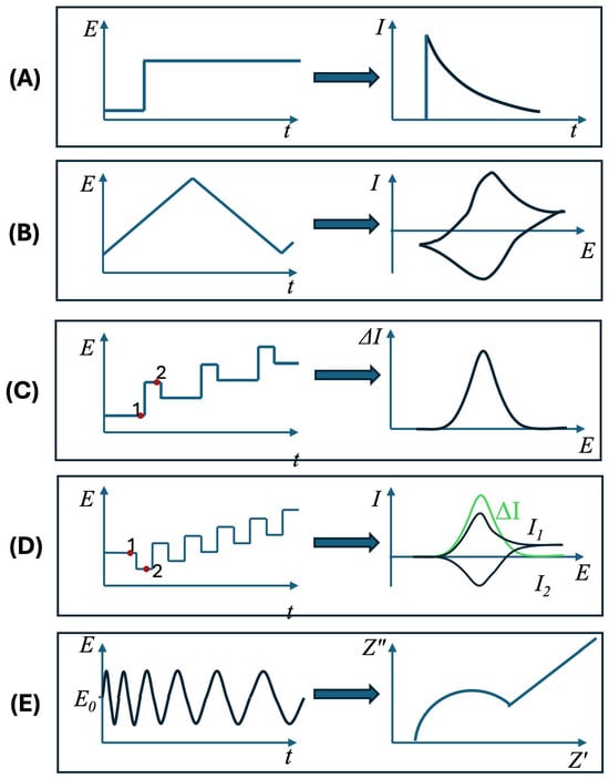 Common measurement techniques in electrochemical biosensors. Left panels show the input modulation; right panels are a schematic representation of the obtained signals. (A) Chronoamperometry; (B) cyclic voltammetry; (C) differential pulse voltammetry (DPV); (D) square-wave voltammetry (SWV); (E) electrochemical impedance spectroscopy. Red dots show the points where currents I1 and I2 are measured in DPV and SWV methods; ΔI denotes the difference between the currents.