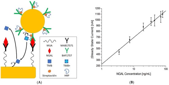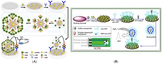 This was demonstrated by Liu et al. [] and Tang et al. [] who immobilized an antibody and HRP to AuNPs. The complexes were then used to form a sandwich together with the antibody on the electrode and the analyte, as shown in Figure 6. In these examples, the purpose of HRP was to generate electroactive species from 3,3′,5,5′-tetramethylbenzidine (TMB) and o-phenylenediamine, which were detected via amperometry and DPV, respectively. Both observed that the use of AuNPs significantly improved the electrochemical response compared to when it was not used. Liu et al. also highlighted how it was possible to further improve the response by modifying the complexes with tyramine labeled biotin and streptavidin labeled HRP, which led to even more HRPs being bound per binding.