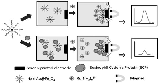 - Lee, C.-Y.; Wu, L.-P.; Chou, T.-T.; Hsieh, Y.-Z. Functional Magnetic Nanoparticles–Assisted Electrochemical Biosensor for Eosinophil Cationic Protein in Cell Culture. Sens. Actuators B Chem. 2018, 257, 672–677. [Google Scholar] [CrossRef]