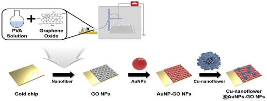 - Baek, S.H.; Roh, J.; Park, C.Y.; Kim, M.W.; Shi, R.; Kailasa, S.K.; Park, T.J. Cu-Nanoflower Decorated Gold Nanoparticles-Graphene Oxide Nanofiber as Electrochemical Biosensor for Glucose Detection. Mater. Sci. Eng. C 2020, 107, 110273. [Google Scholar] [CrossRef] [PubMed]