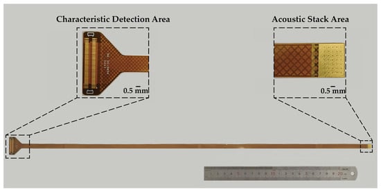 Figure 2 shows the flexible printed circuit (FPC) used for assembling the acoustic stack. In the acoustic stack, the array pitch is 100 µm, the width is 50 µm, and a total of 64 array elements are arranged horizontally. The characteristic detection area is designed to weld the board-to-board interface to ensure the stable connection of the multi-array leads during switching. In this work, the final outer diameter of the outside housing is about 7.5 Fr (2.5 mm).