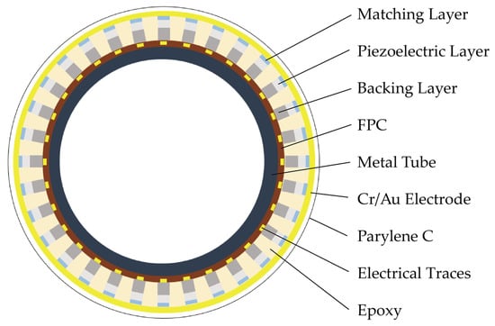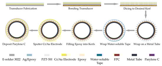 Figure 3 presents a cross-sectional view of the 64-element ring-annular array. The fabrication of the array utilized mechanical micromachining techniques. A strip with the dimensions 0.4 mm × 8 mm × 0.284 mm was initially prepared and then employed to create the ring-annular array. The fabrication steps are outlined in Figure 4. Initially, an E-Solder 3022 (Von Roll USA Inc., Schenectady, NY, USA) was used to secure the strip-shaped transducer elements onto the corresponding pads of the customized FPC (thickness ~100 µm), ensuring electrical connectivity to the backing layer. A 25 µm thick dicing saw was subsequently used to separate the electrical connections between the transducer elements. It is essential to carefully control the blade height during the dicing to ensure proper alignment with the surface of the FPC, guaranteeing the correct separation of the array elements. After dicing, the FPC was wrapped around a metal tube with a 1.8 mm outer diameter. Epo-Tek 301 was applied to the tube’s surface, and the FPC was tightly conformed around the tube using a clamp. The FPC was wrapped around the metal tube before Epo-Tek 301 was injected to achieve a smaller outer diameter of the tube. The assembly was then placed in an oven at 45 °C for 6 h to cure. Non-conductive Epo-Tek 301 was injected into the kerfs to provide insulation between the top and bottom electrodes. To protect the transducer’s front surface, water-soluble tape was applied during this process. Finally, the probe was sputtered to ground the matching layer surface, and the complete device was encapsulated using a Parylene C vacuum deposition system.