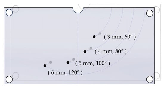 The axial and lateral resolution tests were conducted using a tungsten wire imaging set-up with four 50 μm tungsten wires as reflectors. Holes were drilled on the acrylic phantom at positions (3 mm, 60°), (4 mm, 80°), (5 mm, 100°), and (6 mm, 120°) in the () plane, through which the four 50 μm tungsten wires were straightened and passed. The custom acrylic phantom with tungsten wires is shown in Figure 5. The resolutions of the ring-annular array were calculated by imaging the tungsten wire imaging set-up in degassed water using the Vantage system (Verasonics Data Acquisition System, Verasonics Inc., Redmond, WA, USA). The theoretical resolution of the axial field is calculated as follows [2]: