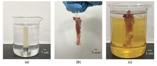 The fabrication steps and proportions of the vascular phantom refer to the study conducted by Ryan et al. on the gelatin-based vascular phantom [31]. A gelatin phantom was fabricated for imaging by mixing a weight ratio of 30% gelatin (Sinopharm Chemical Reagent Co., Ltd., Shanghai, China) and a weight ratio of 2% cellulose (S3504, Sigma-Aldrich Ireland Ltd., Wicklow, Ireland) in degassed water on a heating plate with continuous stirring. The mixture was cooled to 30 °C while stirring and then poured into a custom-designed mold. After solidifying in a 4 °C refrigeration chamber for 6 h, the gelatin scattering phantom with an inner diameter of 6 mm and an outer diameter of 12 mm was removed from the mold, as shown in Figure 6a. Ex vivo porcine coronary artery imaging was also conducted in this study. As illustrated in Figure 6b, coronary arteries were extracted from a fresh porcine heart. The vessels were fixed using a weight ratio of 15% gelatin to create an ex vivo porcine coronary artery phantom for the coronary artery imaging tests.