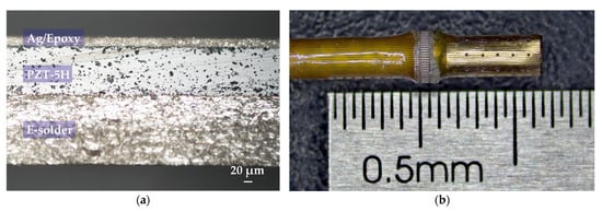 Based on the fabrication process described in Section 2.2.1, the three-layer transducer structure is shown in Figure 7a. Subsequently, the 64-element ring-annular IVUS array, fabricated using the precision-cutting-based micromachining process designed in this study, is shown in its post-sputtered catheter form in Figure 7b.