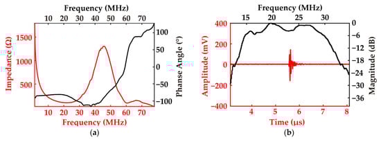 The measurements from the transducer with a 40 channel: (a) impedance spectrum and (b) pulse–echo test.