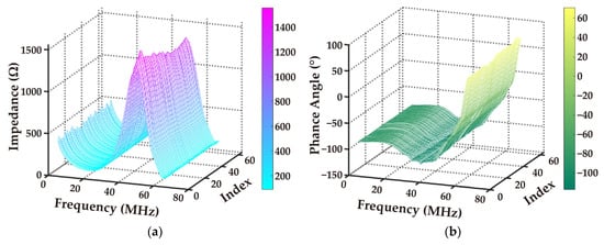 The impedance amplitude and phase spectra of the 64-element array were measured by probing two test pins connected to the impedance analyzer. These probes were switched at the pads within the characteristic detection area of the FPC. The resulting impedance spectra are shown in Figure 9.