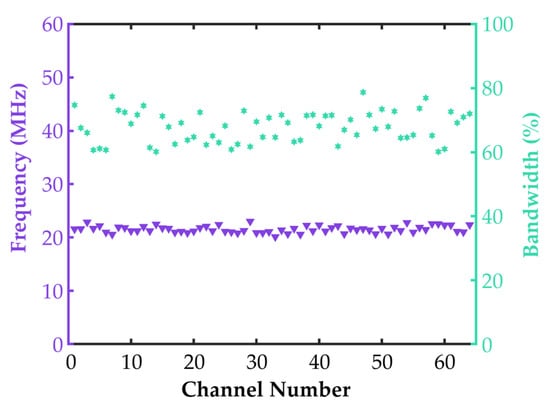 In the pulse–echo test, the center frequency and −6 dB bandwidth of the 64-element array were obtained, as shown in Figure 10. The measured center frequency and −6 dB bandwidth of the 64-element array are 21.51 ± 0.65 MHz and 67.87 ± 4.84%, respectively.
