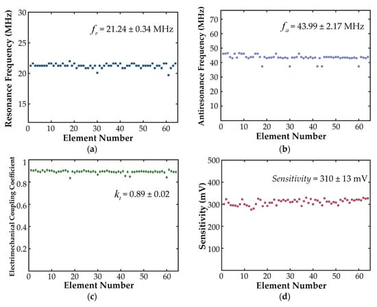 (a) Measured resonance frequency () of 64 elements; (b) measured antiresonance frequency () of 64 elements; (c) measured electromechanical coupling coefficient () of 64 elements; (d) measured peak–peak sensitivity of 64 elements.