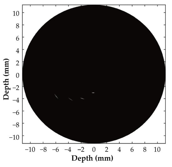The imaging results of the tungsten wire imaging set-up using the synthetic aperture imaging method on the Vantage data acquisition system, with a dynamic range of 40 dB, are shown in Figure 12.