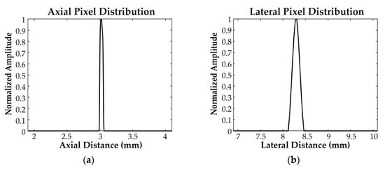 An analysis of the tungsten wire set-up imaging results in Figure 11 demonstrates the axial and lateral pixel distributions of the 64-element ring-annular array, as shown in Figure 13a and Figure 13b, respectively. The measured axial and lateral resolutions of the ring-annular array were determined to be 56 μm and 276 μm, respectively.