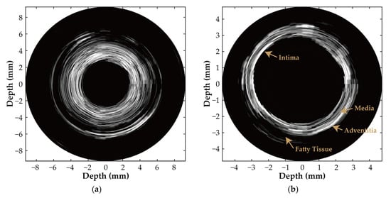 Similarly, using the Vantage acquisition system and the synthetic aperture imaging method, the B-mode imaging results with a dynamic range of 40 dB for the vascular gelation phantom and the ex vivo porcine coronary artery phantom are shown in Figure 14a and Figure 14b, respectively. The comparison was made between the echo signal and the average signal from the non-tissue area in two different phantoms. The signal-to-noise ratio (SNR) of the gelatin vascular phantom was measured to be 28.4 dB, while the SNR of the vascular phantom was 44.1 dB. The inner diameter of the vascular phantom, which is clearly observed in Figure 14a, is 6 mm, and the outer diameter is 12 mm. In Figure 14b, the intima, media, adventitia, and fatty tissue of the vessel can be observed.