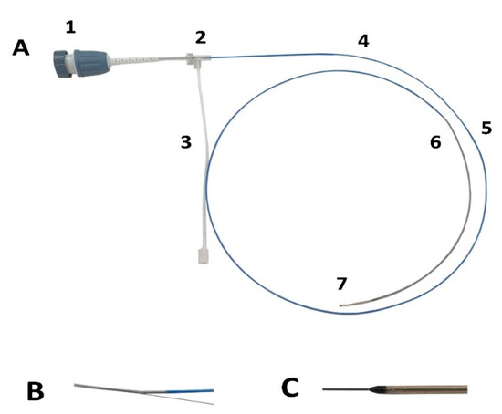 Prototype bOCT catheter. (A) Whole catheter; (1) PIU (connector), (2) side-arm luer, (3) manifold, (4) proximal shaft (braided tube), (5) distal shaft (braided tube), (6) tip, (7) guidewire port/purge exit. (B) Guidewire through the proximal exit port on the side. (C) Guidewire through the entry port at the distal end.