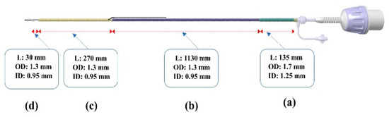 The catheter developed for this study comprises a shaft and a manifold handle, with the shaft divided into four distinct segments, from the proximal to distal parts. The structure of the catheter with the inner and outer diameters of each layer is depicted in Figure 2.