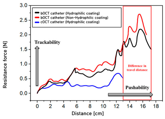 As shown in Figure 4, trackability was measured based on the hydrophilic coating on the surface of the catheter, indicating that the hydrophilic coating significantly enhances trackability by reducing surface friction. The hydrophilic coating on the bOCT catheter results in smoother penetration through the flow path, lowering resistance and improving the overall performance compared to the non-hydrophilic version.