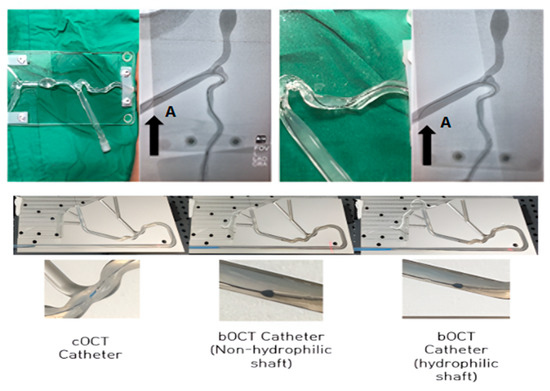 The trackability analysis results using a physical model was also similar to the results in the previous section. When a clinician tested the cOCT and bOCT catheters, as shown in Figure 5, the conventional cOCT catheter could not pass through a tortuous flow path and buckled at point A (indicated with an arrow in Figure 5). Conversely, the bOCT catheter exhibited a stable entry performance because it effectively transmitted the force from the proximal part. In addition, it passed point A and a blood vessel branch bent at 90°. The bOCT catheter with a braided wire exhibited superior trackability performance compared with the existing cOCT catheter.