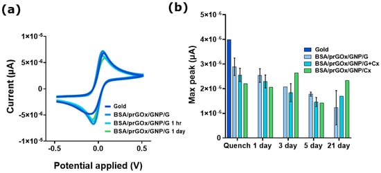 (a) BSA/prGOx/GNP/G coating current densities measured by cyclic voltammetry (CV). (b) Current density remained high for all BSA/prGOx/GNP/Ab coatings even after 21 days of incubation with 1% BSA; no signal was detected on the gold uncoated electrode (n = 2). The data are presented as mean ± standard deviation (SD).