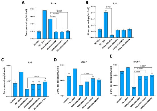 Monitoring pro-inflammatory cytokine expression is essential for optimal biomaterial design and functionality, as the release of high levels of cytokines, such as IL-6 and TNF-α, suggests an enhanced inflammatory response and potential material rejection, while anti-inflammatory cytokines like IL-10 indicate better material integration [43,44]. To discern the impact of BSA/prGOx/GNP/ab on these responses, we analyzed the expression of key pro- and anti-inflammatory markers (IL-6, IL-1α, IL-10, IL-8, VEGF, MIP-1α, MCP-1, and TNF-α) in fibroblast supernatants after 1 day of contact with the coating, and results were normalized to cell counts [43,44]. For BSA/prGOx/GNP, the levels of IL-1α, IL-8, IL-6, VEGF, and MCP-1 closely mirrored the biocompatible control plastic dish, suggesting a neutral cellular response, which is often preferable for implanted devices (Figure 6) [4,43]. MIP-1α, IL-10, and TNF-α secretion were either absent or under the limit of detection (LoD) for all conditions. Compared to fibroblasts exposed to BSA/prGOx/GNP, cells exposed to the BSA/prGOx/GTA coating upregulated IL-1α expression (p < 0.0001) and significantly downregulated IL-6 (p < 0.001) and MCP-1 (p < 0.01) when compared to BSA/prGOx/GNP/Cx and VEGF (p < 0.01) compared to BSA/prGOx/GNP/. BSA/prGOx/GNP exhibited marked suppression of pro-inflammatory IL-1α and overall cytokine levels compared to the negative control, again underscoring its non-inflammatory nature. However, the slight cytokine elevation observed in cells on BSA/prGOx/GNP/Cx could suggest a reduced level of biocompatibility for Cx when compared to G as an antimicrobial component.