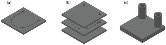 Three-dimensional view of the proposed design: (a–c) show the complete assembly process. (a) CAD design of the mm glass with the through microchannel. (b) Glasses involved in the whole device. (c) Final appearance of the microfluidic device: overlapping glasses and tube adapters.