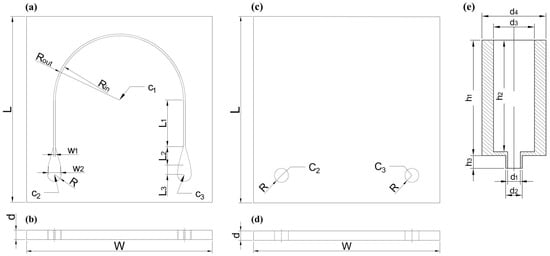 (a) Top view and (b) side view of the through microchannel design. (c) Top view and (d) side view of the covering with the access holes. (e) Cross-section of the tube-to-channel adapters. The labels of the design parameters are included and the values are shown in Table 1.