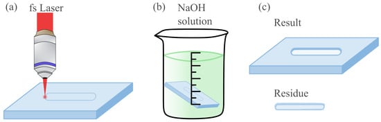 Ultrafast laser-assisted etching (ULAE) was considered as the fabrication method due to its micrometer accuracy for the fabrication of the microchannel and holes in fused silica glass. ULAE is a two-step subtractive technique (Figure 3). First, the fused silica glass is irradiated by femtosecond laser pulses and then it undergoes wet chemical etching []. These are complementary processes, as the material is initially modified at highly localized points corresponding to the irradiation of laser focal points, and then the chemical solution affects the laser-modified areas more intensely than non-modified regions, by a factor of three orders of magnitude. The femtosecond inscription process is highly dependent on the polarization of the laser beam, unless under specific conditions, precisely termed the polarisation-independent region as determined by Ochoa, M. et al. []. Although the ULAE method started using HF as the chemical solution in the second step, nowadays, chemical bases such as NaOH are becoming more common. Etching rates with NaOH indicate 300 µm/h in damaged regions and 0.5 µm/h in pristine fused silica [].