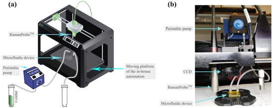The operation of the microfluidic device required the installation of tubing into the resin parts to create a circuit for the sample flow through the device. The inlet tubing was connected to the outlet of an open-source peristaltic pump, and the outlet tubing was directed to a collection container. The input tube of the peristaltic pump corresponded to the liquid sample container. Figure 5a shows the above configuration, as well as the placement of the device in the Raman spectroscopy system. Raman measurements were performed using a custom Raman probe setup from Inphotonics, which employs a 532 nm RGB Lasersystems Lambda Laser and QEPRO Ocean Insight’s spectrometer. The equipment was integrated into an in-house automation system, where a CCD camera was used to target the measurements, and data acquisition and processing were performed using software based on Matlab (R2024a). Finally, an image of the complete unit in the laboratory is shown in Figure 5b.