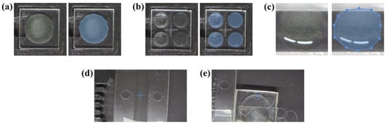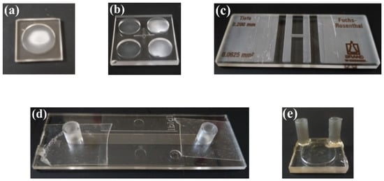 Substrates considered in the device validation process: (a) 20 µL single-well plate, (b) 5 µL 2 × 2 well array plate, (c) counting chamber, (d) µ-Slice I0.2 Luer and (e) the microfluidic device.