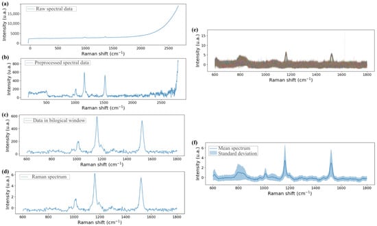 Scheme of data processing: from (a) raw spectrum to (b) preprocessed step with baseline consideration, domain restriction and filtering. Then, (c) spectrum was restricted to the ROI and (d) standardised. Finally, from (e), each spectrum data set of each substrate, (f) the mean spectrum and standard deviation were considered.