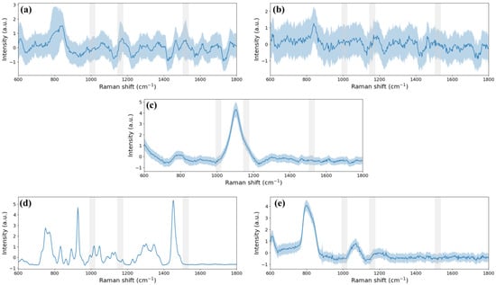 Mean Raman spectrum (line) and standard deviation (shadow) of the substrates: (a) 20 µL well, (b) 5 µL wells and (c) counting chamber, (d) Luer µ-Slide and (e) microfluidic device. Three grey bands indicating the position of the peaks of the reference sample are included.