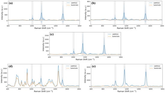 Mean Raman spectrum without normalisation of 20 µL of the reference sample (blue continuous line) and the substrate (orange dashed line) with standard deviation (shadow line on both sides) of the measurements when droplet deposition: (a) 20 µL well, (b) 5 µL wells and (c) counting chamber, or with sample flowing: (d) Luer µ-Slide and (e) microfluidic device. Three grey bands indicating the position of the peaks of the reference sample are included.