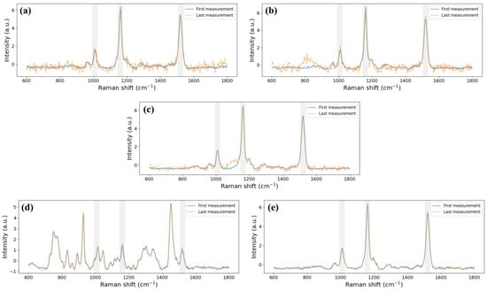 First (blue continuous line) and last (orange dashed line) Raman spectrum of 20 µL of the reference sample when droplet deposition: (a) 20 µL well, (b) 5 µL wells and (c) counting chamber, or with sample flowing: (d) Luer µ-Slide and (e) microfluidic device. Three grey bands indicating the position of the peaks of the reference sample are included.