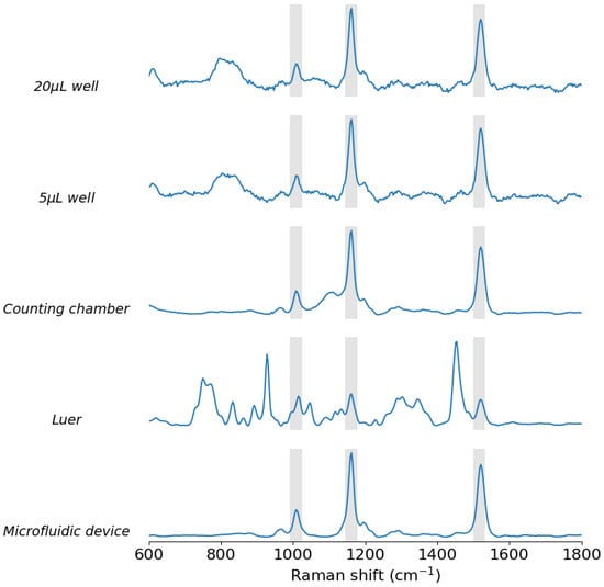 Mean spectrum of the spectra data set of 20 µL of the reference liquid sample measured: in the 20 µL well, in the 5 µL wells, in the counting chamber, in the Luer µ-slide and in the microfluidic device. Three grey bands indicating the position of the peaks of the reference sample are included.