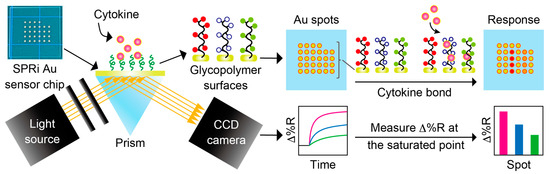 In this research, we investigated the adsorption of cytokines onto a glycopolymer-modified (GM) surface. For the investigation and analysis of such unknown biological interactions, a high-throughput biosensing platform was needed. We adopted the surface plasmon resonance imaging (SPRi) technique as the biosensing platform [31,32]. Biological interactions on the multiple Au spots sputtered onto a glass chip could be measured by monitoring the reflectivity of the light irradiated onto the Au surfaces. The glycopolymers used in this research were synthesized by reversible addition-fragmentation chain transfer (RAFT) polymerization [33,34,35]. This polymerization method enabled the control of polymer length and the presentation of a thiol group at the terminal of the main polymer chain, which enabled the direct immobilization of glycopolymers onto the Au surfaces. The glycopolymers with different types of glycan residue were individually modified on the Au surfaces of the SPRi sensor chip, and the adsorption of cytokines was investigated. We revealed the differences in the adsorption of anti- and pro-inflammatory cytokines onto the GM surfaces. The potential of the GM surface with a specific glycan residue for preferential interaction with the pro-inflammatory cytokine was also indicated. Such differences in the interaction or adsorption properties of cytokines to various GM surfaces possessing different glycan residues were unknown in former research [30]. The preferential adsorption of cytokines to glycans and glycopolymers is beneficial for further understanding glycoengineering. We also expect the use of GM surfaces in bioengineering applications such as cell analysis and diagnostic devices in the future.