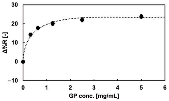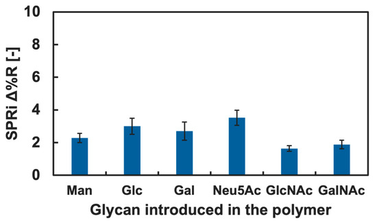 Immobilization of the glycopolymers onto the Au surface was measured using the SPRi method. The SPRi reflectivity change (Δ%R) by the 100-mer glycopolymer bond to the Au surface of the SPRi chip is shown in Figure 3. The Δ%R value increased as the concentration of the glycopolymer increased, indicating the immobilization of glycopolymers onto the Au surface. The binding curve showed the Langmuir binding of the glycopolymer, which indicated that the independent bond of each glycopolymer chain and the glycopolymers were uniformly immobilized onto the Au surfaces [39]. Furthermore, the immobilization of the glycopolymer onto the Au surface was saturated at the polymer concentration of 2.5 mg/mL, and it was expected that the Au surface was covered with glycopolymers and that glycan residues were two-dimensionally presented on the Au surface with sufficient density for interaction with the target protein. It was also reported in the previous studies that the area per molecule and the thickness of the 100-mer length glycopolymer was 1.6 nm2 [40] and 3.6 nm [39], respectively. The glycopolymer structure used in that report also used a monosaccharide (mannose) as the glycan residue and resembled the glycopolymer used in this research, indicating that the glycopolymer structure formed on the Au surface may be exceedingly close to that of the other report. As a result, it was assumed that a mushroom-like collapsed structured glycopolymer layer was formed on the Au surface [39].