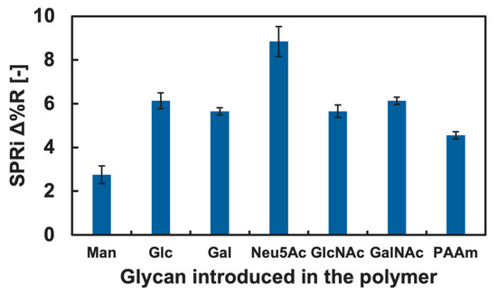 Changes in the Δ%R value by the addition of the blank PBS(-) solution for over 30 min were approximately 0 with deviation of ±0.3, and this was assumed as an instrumentally derived deviation. Considering the amount of change in the Δ%R value (>1.5), we assumed that both IL-4 and TNF-α showed adsorption against the GM surfaces. However, significant differences among the types of glycan residue introduced in the polymers were not observed for the addition of IL-4 (Figure 4), and we assumed that a specific interaction between IL-4 and the GM surfaces was not observed. By contrast, TNF-α indicated slightly preferential adsorption to the GM surfaces presenting Neu5Ac residues compared to the GM surfaces presenting other glycan residues. Furthermore, the changes in the Δ%R value for the polymer surface without glycan residue (PAAm) were smaller than that of the glycopolymer surface with Neu5Ac and even smaller for the GM surfaces with Glc, Gal, GlcNAc, and GalNAc residues (Figure 5). These results indicated that a glycan residue (especially Neu5Ac) was necessary for the interaction with TNF-α.