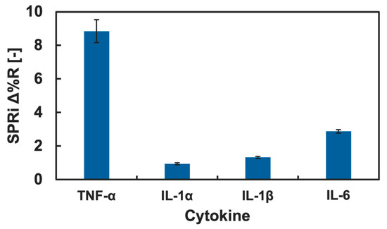 TNF-α showed relatively preferential adsorption onto the Neu5Ac-introduced GM surface. However, the binding preference of the Neu5Ac glycopolymers to other cytokines is unknown. We investigated the binding preference of the Neu5Ac-introduced glycopolymer with cytokines using the SPRi technique, and since TNF-α is categorized as a pro-inflammatory cytokine, the adsorption to the Neu5Ac-introduced glycopolymer was compared to other pro-inflammatory cytokines: IL-1α, IL-1β, and IL-6. The SPRi measurement result of pro-inflammatory cytokine adsorption onto the GM surfaces is summarized in Figure 6.