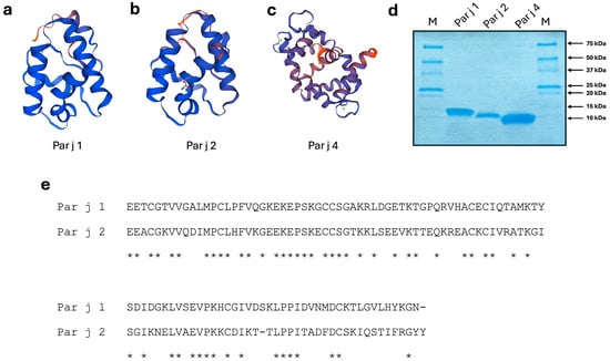 Parietaria allergens (known also as pellitory or wall pellitory) primarily consist of two major proteins: Par j 1 and Par j 2, belonging to the nonspecific lipid transfer protein (ns-LTP) family which represents one of the major classes of allergenic proteins with particular reference to food allergens []. They are both glycoproteins, capable of causing severe allergic reactions due to their 3D structure composed of four alpha-helices forming a hydrophobic cavity. This region can bind and transfer lipid molecules and it is stabilized by the presence of eight cysteines, forming four cysteine bridges with a signature characteristic of all the components of the ns-LTP allergens []. This class of allergens is known for its stability and resistance to degradation, allowing it to remain active and allergenic for prolonged periods. Par j 1 and Par j 2 display a 51.5% homology at the amino acid level, as shown in Figure 1e. Both proteins are cross-reactive, but the subtle differences in their structure can lead to variations in the immune response of different individuals []. So far, no cross-reactivity with other ns-LTP from other sources has been described. Calcium-binding proteins (CBP) contain a variable number of motifs, termed EF-hands, which consist of two perpendicularly placed alpha-helices and an inter-helical loop forming a single calcium-binding site. Par j 4 is a cross-reactive 2-EF-hand allergen CBP which is a minor allergen in the Mediterranean area. It has been clearly demonstrated its cross reactivity with other components of the CBP family from several allergenic sources []. Par j 1–2 and Par j 4 do not display any relevant homology at the amino acid level and do not show immunoglobulin E (IgE) cross reactivity []. In Table S1 of the Supplementary Materials, the abundance of amino acids, different for each analyzed Par j protein, is shown.