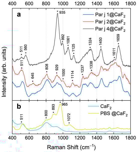 (a) Raman spectra of Par j 1 (blue line), Par j 2 (red line), and Par j 4 (black line) acquired on CaF2 substrate. The spectra are stacked for a better visualization. (b) Raman spectrum of PBS on CaF2 substrate (yellow line) and that of CaF2 substrate itself (cyan line). Asterisks * indicate the center frequencies of the Raman peaks.