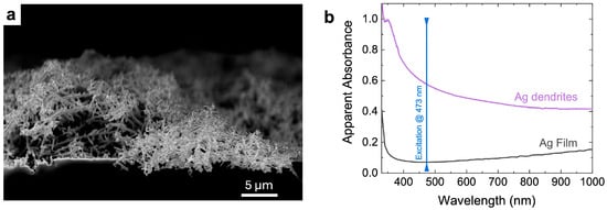 (a) Scanning electron microscopy image of the as-grown Ag dendrites in plan view; (b) apparent absorbance (extinction) spectrum of Ag dendrites (violet line) and Ag flat substrate (black line) [,] in the UV–vis–NIR range, obtained as commented in Section 2.2.