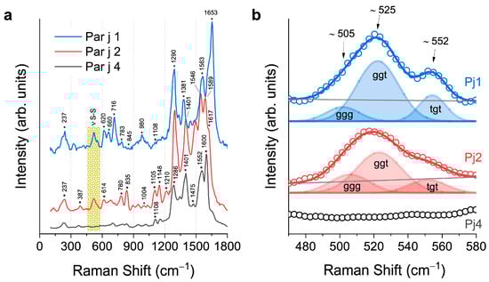 The three recombinant proteins of Parietaria judaica have been characterized by Raman spectroscopy [,,,,] for the first time in the literature. Raman spectroscopic analysis was initially performed on protein solutions in PBS (see Section 2.3). However, when acquiring Raman signals from the liquid drop, only the O-H bending and stretching modes of water were detected, as the protein’s vibrational signals remained below the detection threshold (see Figure S1 in the Supplementary Information). To address this limitation, we attempted to concentrate the protein on the substrate, although this resulted in the loss of information regarding the number of molecules per unit volume. Figure 2 shows the Raman spectra in the region between 400 and 1800 cm−1 representing the protein fingerprint. All spectra were acquired by exciting the protein onto a CaF2 substrate using a wavelength of 473 nm, as described in Section 2.3. The top panel (a) of the graph shows the spectra of the three proteins (Par j 1, blue line, Par j 2, red line, and Par j 4, black line) after removing the fluorescence contribution (see Figure S2 in Supplementary Information for details), while the bottom panel (b) shows the Raman spectra of the reference materials, i.e., the CaF2 substrate (cyan line) and the PBS deposited on it (yellow line). The protein fingerprints of Par j 1 and Par j 2 are very similar, confirming the analogies in their primary structure (see Figure 1). Table 1 provides the assignments of the main vibrational contributions highlighted in the graph. Signals at 645 cm−1, 1000 cm−1, 1114 cm−1, 1237 cm−1, 1338 cm−1, 1450 cm−1, 1611 cm−1, and 1659 cm−1 are attributable to the vibrational modes of protein functional groups (Table 1). In contrast, signals at 511 cm−1, 808 cm−1, and 929 cm⁻¹ are challenging to discriminate, being probably due to the overlapping between the protein vibrational contributions with signals coming from CaF2 and PBS (see Figure 2b).